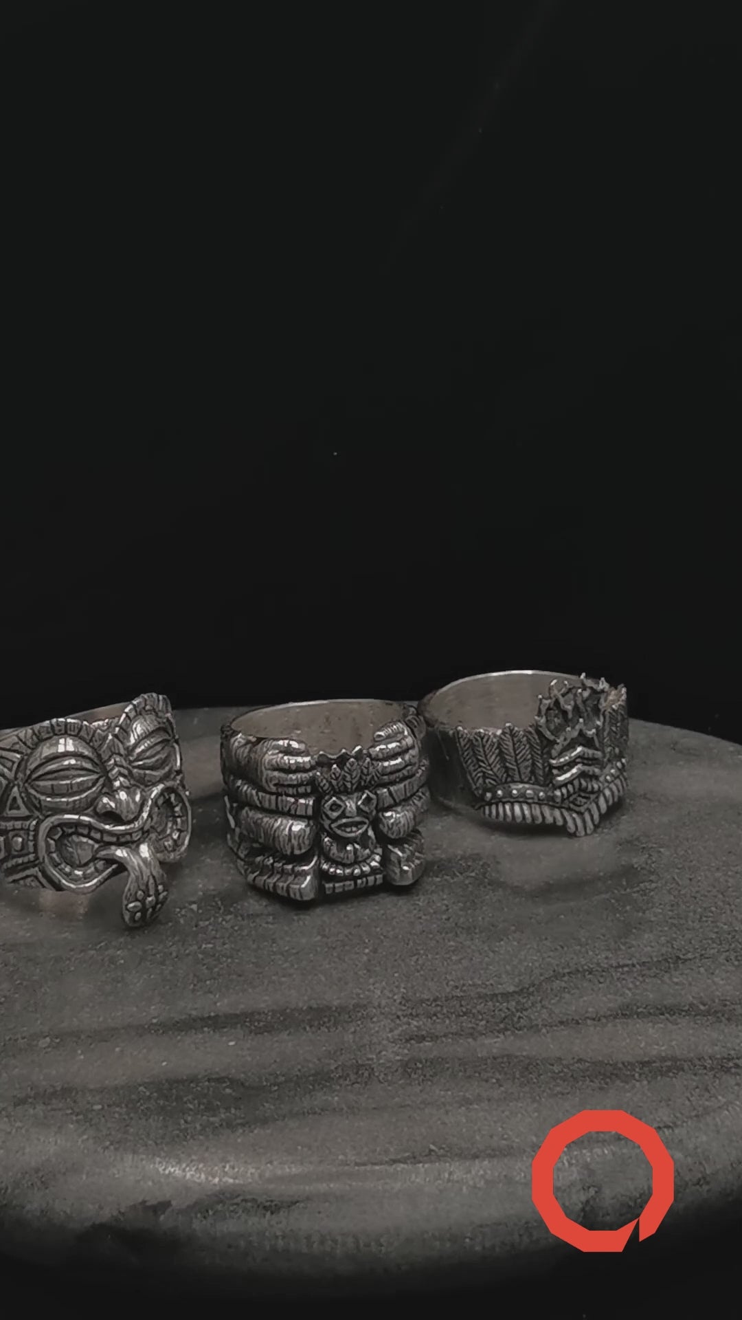 Drawing inspiration from the classic Tiki mugs used in tropical-themed bars and restaurants, this ring set echoes Polynesian and nautical themes, bringing a retro twist to your jewelry collection. Each ring is hand-sculpted and designed to interlock, creating a striking totem when assembled.